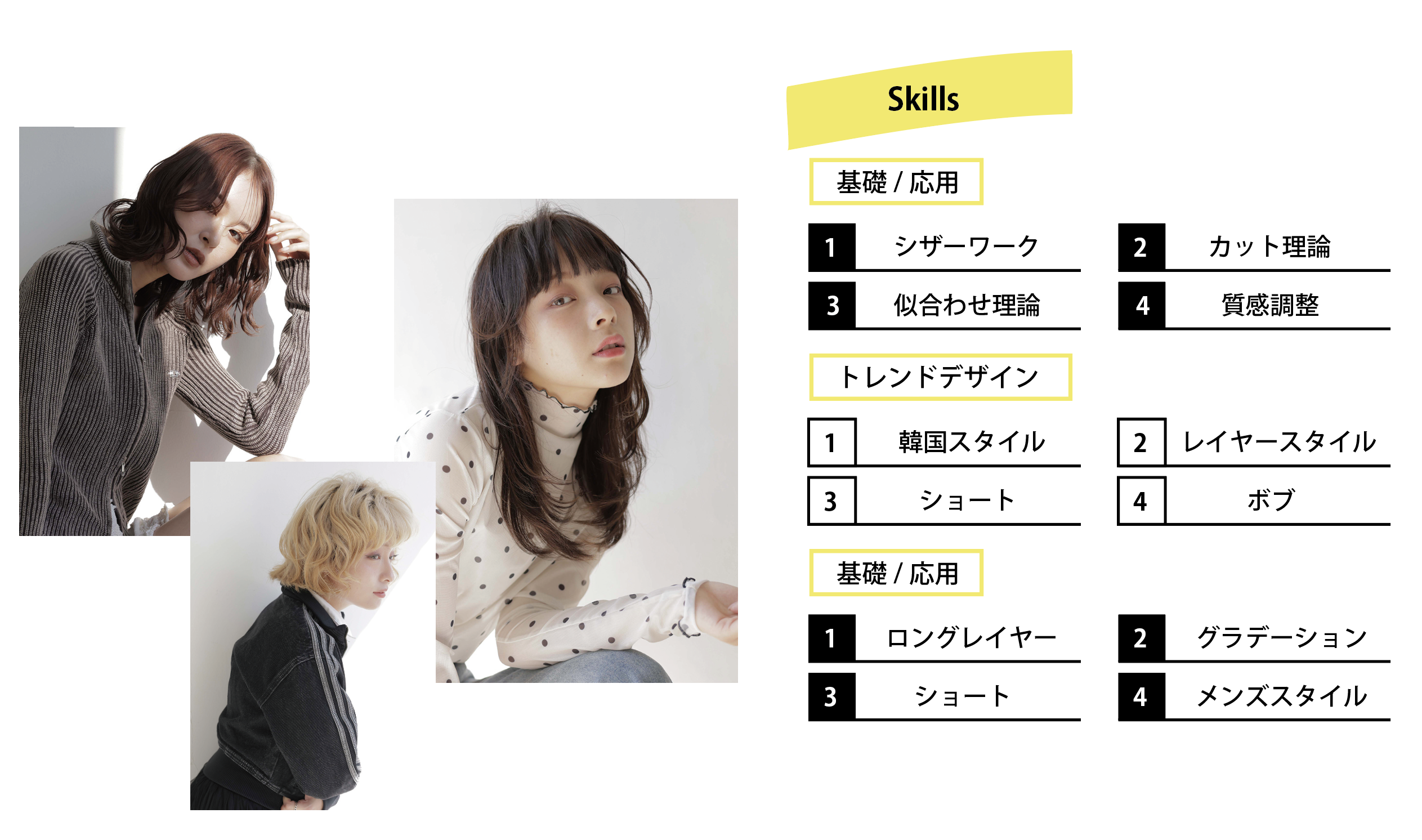 Leeなら流行の韓国スタイルやレイヤーカット、メンズスタイルなどの最新のスタイルはもちろん、 基礎的なカット技術、さまざまな場面で役立つ応用技術、そしてカット理論も身につけれる!